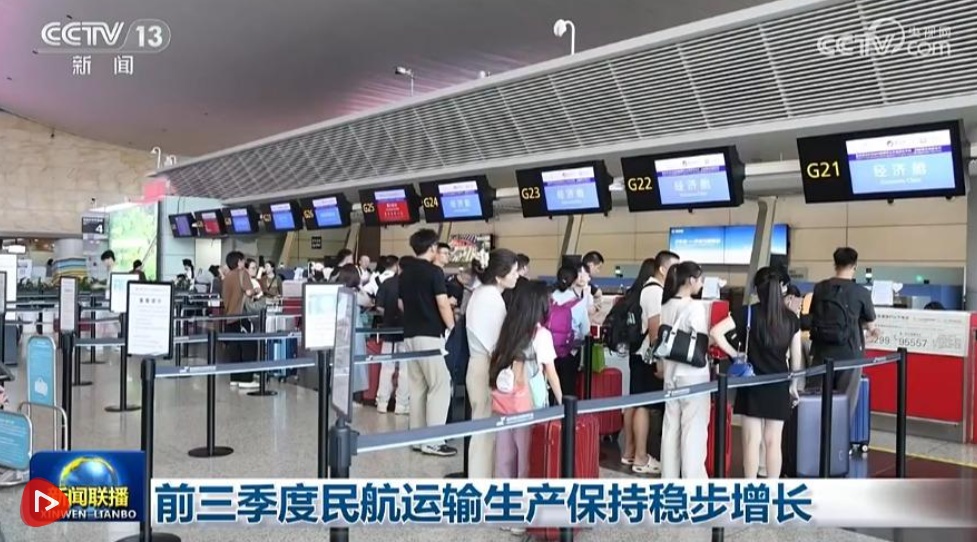 央视新闻(新闻联播)记者从民航局获悉,今年前三季度民航运输生产保持持续增长。全行业运输总收入、旅客运输量、货邮运输量分别比上年增长10.3%、5.2%和14%。