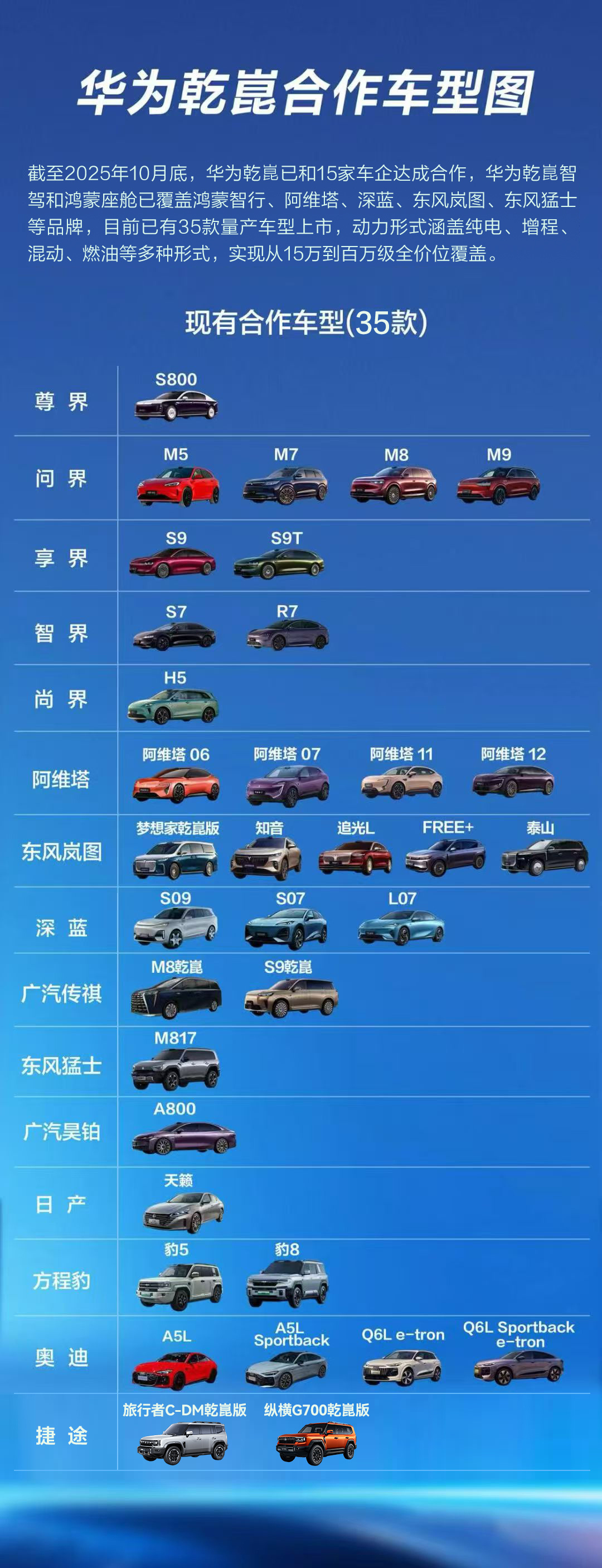 通过内部开发的技术和开放协作的生态模式 与15家车企合作(截至2025年10月) 华为乾坤正在致力于: 您可以随时安心离开。 让每一次旅行都精彩! 一群志同道合的旅行者 多方聚会 最终,这将是中国汽车工业的一条坚实的前进道路。 让我们共同推动中国汽车工业的发展 在世界舞台上 跑得更努力,走得更远! 它向下扎根,向上生长。 华为致力于让出行更安全 生活变得更好 人们手牵手行走 让我们一起相爱吧! (本文为宣传稿)